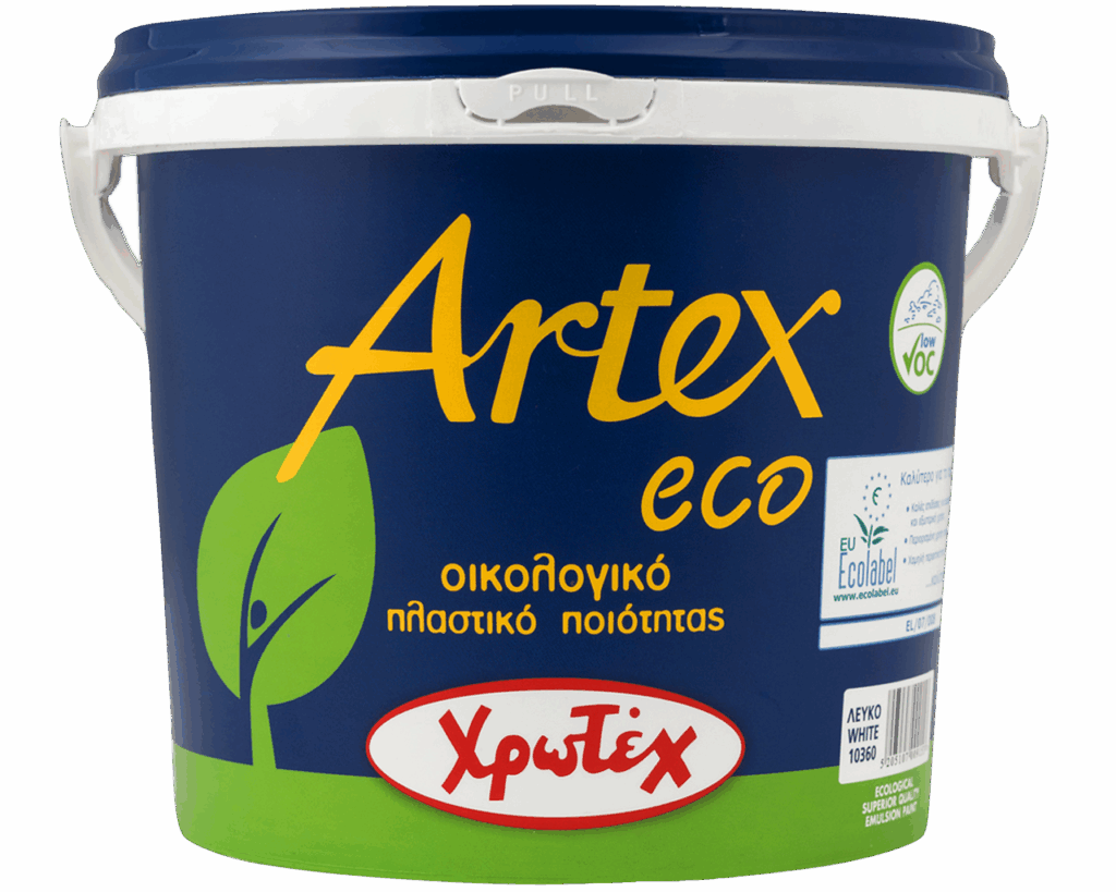 Πλαστικό χρώμα άριστης ποιότητας, άοσμο και πιστοποιημένο οικολογικό με το σήμα της «μαργαρίτας». Προστατεύει το χρήστη και το περιβάλλον κατά την εφαρμογή. Το ARTEX ECO δεν περιέχει βαρέα μέταλλα, επικίνδυνες ουσίες, αμμωνία, φορμαλδεΰδη και αρωματικούς υδρογονάνθρακες. Χαρακτηρίζεται από μεγάλη ευκολία εφαρμογής, υψηλή καλυπτικότητα και απόδοση, άριστες αντοχές στις διεργασίες καθαρισμού (πλύσιμο-καθάρισμα), αντοχή σε κλιματολογικές καταπονήσεις και σχεδόν ανύπαρκτο πιτσίλισμα κατά την εφαρμογή. Αποχρώσεις: διατίθεται σε λευκό και χρωματίζεται σε 2500 αποχρώσεις μέσω του συστήματος CHROMASYSTEM.