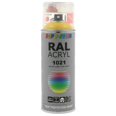 Ακρυλικό σπρέι βαφής κίτρινο γυαλιστερό/RAL 1021 Dupli Color, υψηλής ποιότητας. Ιδανικό για βάψιμο και προστασία μεταλλικών επιφανειών όπως μηχανών και μεταλλικών τμημάτων οχημάτων. Κατάλληλο για βάψιμο ξύλινων, μπαμπού ή μεταλλικών επίπλων μέσα στο σπίτι ή στον κήπο. Χαρακτηριστικά: εξαιρετική πρόσφυση σε πλήθος υλικών, αντοχές σε καιρικές συνθήκες και ακτίνες UV, γυαλιστερό φινίρισμα.