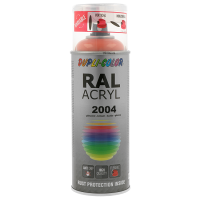 Ακρυλικό σπρέι βαφής πορτοκαλί γυαλιστερό/RAL 2004 Dupli Color, υψηλής ποιότητας. Ιδανικό για βάψιμο και προστασία μεταλλικών επιφανειών όπως μηχανών και μεταλλικών τμημάτων οχημάτων. Κατάλληλο για βάψιμο ξύλινων, μπαμπού ή μεταλλικών επίπλων μέσα στο σπίτι ή στον κήπο. Χαρακτηριστικά: εξαιρετική πρόσφυση σε πλήθος υλικών, αντοχές σε καιρικές συνθήκες και ακτίνες UV, γυαλιστερό φινίρισμα.