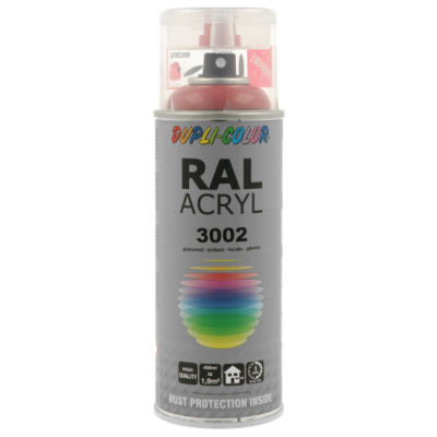 Ακρυλικό σπρέι βαφής κόκκινο γυαλιστερό/RAL 3002 Dupli Color, υψηλής ποιότητας. Ιδανικό για βάψιμο και προστασία μεταλλικών επιφανειών όπως μηχανών και μεταλλικών τμημάτων οχημάτων. Κατάλληλο για βάψιμο ξύλινων, μπαμπού ή μεταλλικών επίπλων μέσα στο σπίτι ή στον κήπο. Χαρακτηριστικά: εξαιρετική πρόσφυση σε πλήθος υλικών, αντοχές σε καιρικές συνθήκες και ακτίνες UV, γυαλιστερό φινίρισμα.