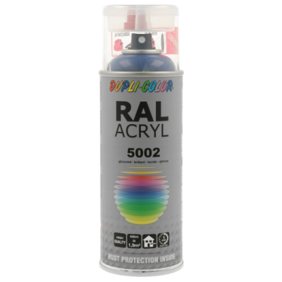 Ακρυλικό σπρέι βαφής μπλε γυαλιστερό/RAL 5002 Dupli Color, υψηλής ποιότητας. Ιδανικό για βάψιμο και προστασία μεταλλικών επιφανειών όπως μηχανών και μεταλλικών τμημάτων οχημάτων. Κατάλληλο για βάψιμο ξύλινων, μπαμπού ή μεταλλικών επίπλων μέσα στο σπίτι ή στον κήπο. Χαρακτηριστικά: εξαιρετική πρόσφυση σε πλήθος υλικών, αντοχές σε καιρικές συνθήκες και ακτίνες UV, γυαλιστερό φινίρισμα.