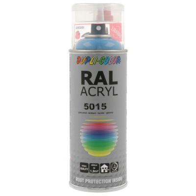 Ακρυλικό σπρέι βαφής μπλε γυαλιστερό/RAL 5015 Dupli Color, υψηλής ποιότητας. Ιδανικό για βάψιμο και προστασία μεταλλικών επιφανειών όπως μηχανών και μεταλλικών τμημάτων οχημάτων. Κατάλληλο για βάψιμο ξύλινων, μπαμπού ή μεταλλικών επίπλων μέσα στο σπίτι ή στον κήπο. Χαρακτηριστικά: εξαιρετική πρόσφυση σε πλήθος υλικών, αντοχές σε καιρικές συνθήκες και ακτίνες UV, γυαλιστερό φινίρισμα.