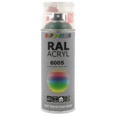 Ακρυλικό σπρέι βαφής πράσινο γυαλιστερό/RAL 6005 Dupli Color, υψηλής ποιότητας. Ιδανικό για βάψιμο και προστασία μεταλλικών επιφανειών όπως μηχανών και μεταλλικών τμημάτων οχημάτων. Κατάλληλο για βάψιμο ξύλινων, μπαμπού ή μεταλλικών επίπλων μέσα στο σπίτι ή στον κήπο. Χαρακτηριστικά: εξαιρετική πρόσφυση σε πλήθος υλικών, αντοχές σε καιρικές συνθήκες και ακτίνες UV, γυαλιστερό φινίρισμα.