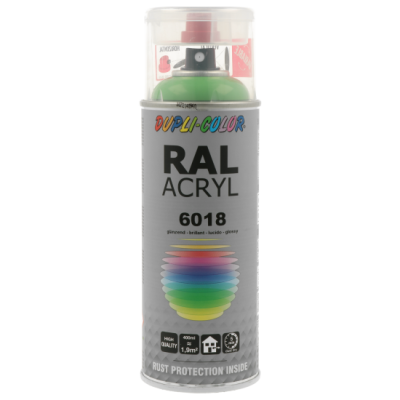 Ακρυλικό σπρέι βαφής πράσινο γυαλιστερό/RAL 6018 Dupli Color, υψηλής ποιότητας. Ιδανικό για βάψιμο και προστασία μεταλλικών επιφανειών όπως μηχανών και μεταλλικών τμημάτων οχημάτων. Κατάλληλο για βάψιμο ξύλινων, μπαμπού ή μεταλλικών επίπλων μέσα στο σπίτι ή στον κήπο. Χαρακτηριστικά: εξαιρετική πρόσφυση σε πλήθος υλικών, αντοχές σε καιρικές συνθήκες και ακτίνες UV, γυαλιστερό φινίρισμα.