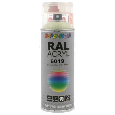 Ακρυλικό σπρέι βαφής πράσινο παστέλ γυαλιστερό/RAL 6019 Dupli Color, υψηλής ποιότητας. Ιδανικό για βάψιμο και προστασία μεταλλικών επιφανειών όπως μηχανών και μεταλλικών τμημάτων οχημάτων. Κατάλληλο για βάψιμο ξύλινων, μπαμπού ή μεταλλικών επίπλων μέσα στο σπίτι ή στον κήπο. Χαρακτηριστικά: εξαιρετική πρόσφυση σε πλήθος υλικών, αντοχές σε καιρικές συνθήκες και ακτίνες UV, γυαλιστερό φινίρισμα.