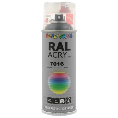 Ακρυλικό σπρέι βαφής γκρι γυαλιστερό/RAL 7016 Dupli Color, υψηλής ποιότητας. Ιδανικό για βάψιμο και προστασία μεταλλικών επιφανειών όπως μηχανών και μεταλλικών τμημάτων οχημάτων. Κατάλληλο για βάψιμο ξύλινων, μπαμπού ή μεταλλικών επίπλων μέσα στο σπίτι ή στον κήπο. Χαρακτηριστικά: εξαιρετική πρόσφυση σε πλήθος υλικών, αντοχές σε καιρικές συνθήκες και ακτίνες UV, γυαλιστερό φινίρισμα.