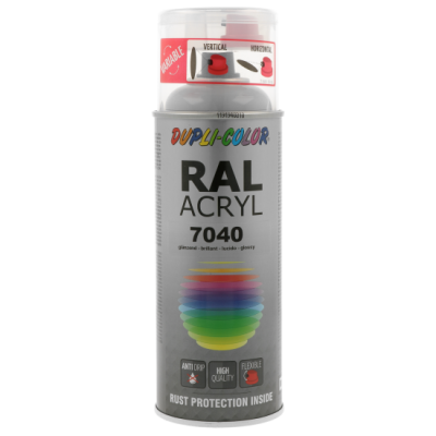 Ακρυλικό σπρέι βαφής γκρι γυαλιστερό/RAL 7040 Dupli Color, υψηλής ποιότητας. Ιδανικό για βάψιμο και προστασία μεταλλικών επιφανειών όπως μηχανών και μεταλλικών τμημάτων οχημάτων. Κατάλληλο για βάψιμο ξύλινων, μπαμπού ή μεταλλικών επίπλων μέσα στο σπίτι ή στον κήπο. Χαρακτηριστικά: εξαιρετική πρόσφυση σε πλήθος υλικών, αντοχές σε καιρικές συνθήκες και ακτίνες UV, γυαλιστερό φινίρισμα.