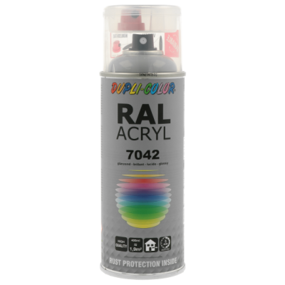 Ακρυλικό σπρέι βαφής γκρι γυαλιστερό/RAL 7042 Dupli Color, υψηλής ποιότητας. Ιδανικό για βάψιμο και προστασία μεταλλικών επιφανειών όπως μηχανών και μεταλλικών τμημάτων οχημάτων. Κατάλληλο για βάψιμο ξύλινων, μπαμπού ή μεταλλικών επίπλων μέσα στο σπίτι ή στον κήπο. Χαρακτηριστικά: εξαιρετική πρόσφυση σε πλήθος υλικών, αντοχές σε καιρικές συνθήκες και ακτίνες UV, γυαλιστερό φινίρισμα.