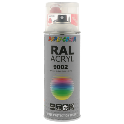 Ακρυλικό σπρέι βαφής λευκό γκρι γυαλιστερό/RAL 9002 Dupli Color, υψηλής ποιότητας. Ιδανικό για βάψιμο και προστασία μεταλλικών επιφανειών όπως μηχανών και μεταλλικών τμημάτων οχημάτων. Κατάλληλο για βάψιμο ξύλινων, μπαμπού ή μεταλλικών επίπλων μέσα στο σπίτι ή στον κήπο. Χαρακτηριστικά: εξαιρετική πρόσφυση σε πλήθος υλικών, αντοχές σε καιρικές συνθήκες και ακτίνες UV, γυαλιστερό φινίρισμα.