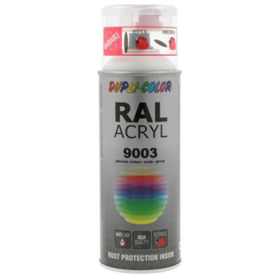 Ακρυλικό σπρέι βαφής λευκό γυαλιστερό/RAL 9003 Dupli Color, υψηλής ποιότητας. Ιδανικό για βάψιμο και προστασία μεταλλικών επιφανειών όπως μηχανών και μεταλλικών τμημάτων οχημάτων. Κατάλληλο για βάψιμο ξύλινων, μπαμπού ή μεταλλικών επίπλων μέσα στο σπίτι ή στον κήπο. Χαρακτηριστικά: εξαιρετική πρόσφυση σε πλήθος υλικών, αντοχές σε καιρικές συνθήκες και ακτίνες UV, γυαλιστερό φινίρισμα.