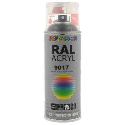 Ακρυλικό σπρέι βαφής μαύρο ματ/RAL 9017 Dupli Color, υψηλής ποιότητας. Ιδανικό για βάψιμο και προστασία μεταλλικών επιφανειών όπως μηχανών και μεταλλικών τμημάτων οχημάτων. Κατάλληλο για βάψιμο ξύλινων, μπαμπού ή μεταλλικών επίπλων μέσα στο σπίτι ή στον κήπο. Χαρακτηριστικά: εξαιρετική πρόσφυση σε πλήθος υλικών, αντοχές σε καιρικές συνθήκες και ακτίνες UV, ματ φινίρισμα.