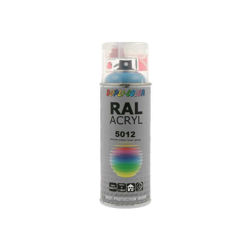 Ακρυλικό σπρέι βαφής μπλέ ανοιχτό/RAL 5012 Dupli Color, υψηλής ποιότητας. Ιδανικό για βάψιμο και προστασία μεταλλικών επιφανειών όπως μηχανών και μεταλλικών τμημάτων οχημάτων. Κατάλληλο για βάψιμο ξύλινων, μπαμπού ή μεταλλικών επίπλων μέσα στο σπίτι ή στον κήπο. Χαρακτηριστικά: εξαιρετική πρόσφυση σε πλήθος υλικών, αντοχές σε καιρικές συνθήκες και ακτίνες UV, ματ φινίρισμα.