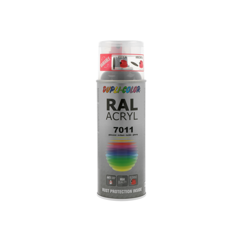 Ακρυλικό σπρέι βαφής γκρι/RAL 7011 Dupli Color, υψηλής ποιότητας. Ιδανικό για βάψιμο και προστασία μεταλλικών επιφανειών όπως μηχανών και μεταλλικών τμημάτων οχημάτων. Κατάλληλο για βάψιμο ξύλινων, μπαμπού ή μεταλλικών επίπλων μέσα στο σπίτι ή στον κήπο. Χαρακτηριστικά: εξαιρετική πρόσφυση σε πλήθος υλικών, αντοχές σε καιρικές συνθήκες και ακτίνες UV, ματ φινίρισμα.