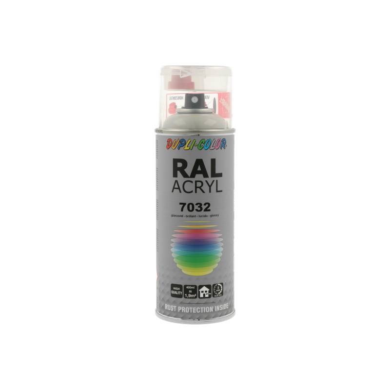 Ακρυλικό σπρέι βαφής γκρι/RAL 7032 Dupli Color, υψηλής ποιότητας. Ιδανικό για βάψιμο και προστασία μεταλλικών επιφανειών όπως μηχανών και μεταλλικών τμημάτων οχημάτων. Κατάλληλο για βάψιμο ξύλινων, μπαμπού ή μεταλλικών επίπλων μέσα στο σπίτι ή στον κήπο. Χαρακτηριστικά: εξαιρετική πρόσφυση σε πλήθος υλικών, αντοχές σε καιρικές συνθήκες και ακτίνες UV, ματ φινίρισμα.