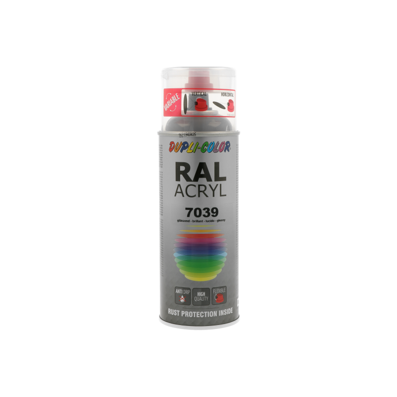 Ακρυλικό σπρέι βαφής γκρι/RAL 7039 Dupli Color, υψηλής ποιότητας. Ιδανικό για βάψιμο και προστασία μεταλλικών επιφανειών όπως μηχανών και μεταλλικών τμημάτων οχημάτων. Κατάλληλο για βάψιμο ξύλινων, μπαμπού ή μεταλλικών επίπλων μέσα στο σπίτι ή στον κήπο. Χαρακτηριστικά: εξαιρετική πρόσφυση σε πλήθος υλικών, αντοχές σε καιρικές συνθήκες και ακτίνες UV, ματ φινίρισμα.