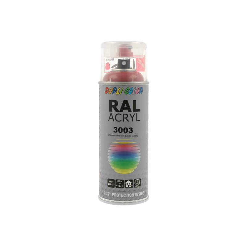 Ακρυλικό σπρέι βαφής κόκκινο γυαλιστερό/RAL 3003 Dupli Color, υψηλής ποιότητας. Ιδανικό για βάψιμο και προστασία μεταλλικών επιφανειών όπως μηχανών και μεταλλικών τμημάτων οχημάτων. Κατάλληλο για βάψιμο ξύλινων, μπαμπού ή μεταλλικών επίπλων μέσα στο σπίτι ή στον κήπο. Χαρακτηριστικά: εξαιρετική πρόσφυση σε πλήθος υλικών, αντοχές σε καιρικές συνθήκες και ακτίνες UV, γυαλιστερό φινίρισμα.
